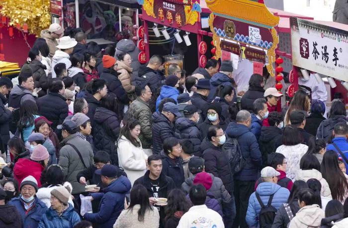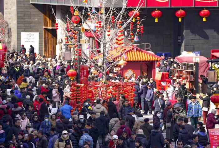 众多市民游客在隆福寺新春集市上游玩。