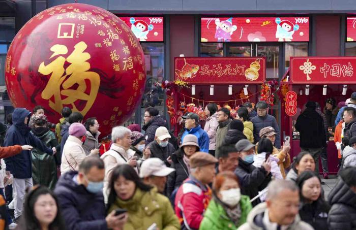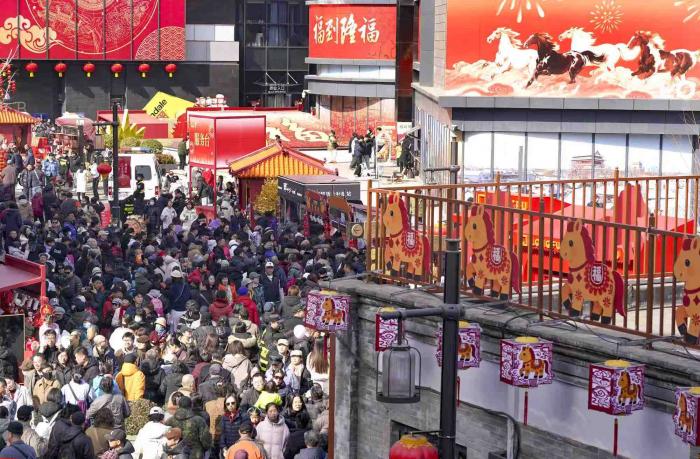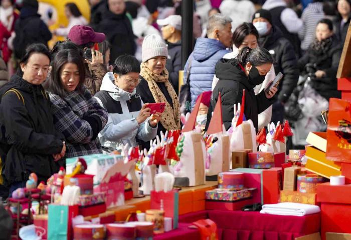 2月20日,在隆福寺商圈以“马不停蹄,隆福潮集”为主题的2026隆福寺新春市集引越来越多的游客前来游览和购物。
