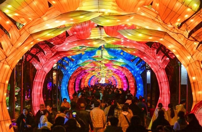 2月19日,游客在河南省洛阳市隋唐城遗址植物园欣赏“神都上元灯会”主题特色灯展。新华社发(李卫超 摄)
