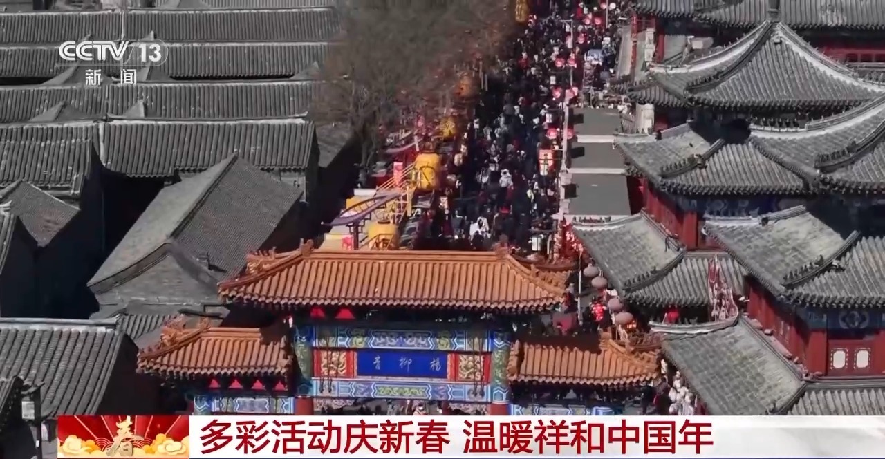 在天津杨柳青古镇,舞蹈、杂技等轮番上演,身着传统服饰的工作人员与游人互动,为大家讲述古镇的年俗故事。