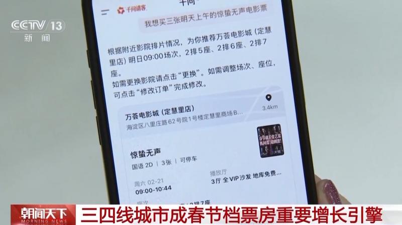 如今,在春节假期看电影已经成为越来越多基层群众的新年俗。今年春节档,全国多座三、四线城市票房表现都很突出,成为拉动整体票房的核心动力。据票务平台数据显示,三、四线城市已连续三年成为春节档票房的绝对主力。除了影片内容更贴合地域偏好等传统原因,今年春节档,AI购票的全新方式也让‌购票更加便捷。今年春节档,山东滨州、辽宁阜新、内蒙古赤峰等三、四线城市影院跻身全国影院票房榜前六名。随着我国电影市场持续向纵深发展,“下沉”市场在春节档展现出了不俗的消费潜力。
