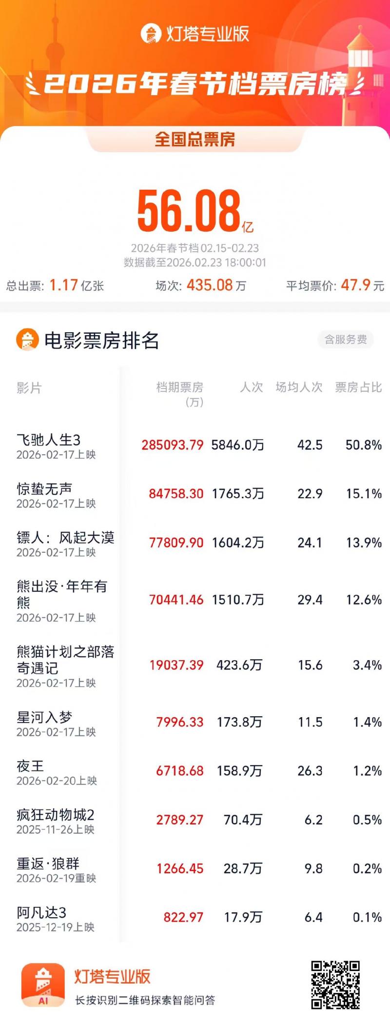 据大麦娱乐旗下灯塔专业版数据,截至2月23日18时,2026年春节档总票房突破56.08亿,总场次435.08万场,总人次1.17亿,平均票价47.9元,总场次大幅刷新中国影史春节档总场次最高纪录,平均票价较去年春节档的50.8元大幅下调接近3元,从大年初一开始大盘平均票价保持连续下调,春节档中后期每日大盘票房跌幅微弱,春节档新片整体质量受到观众认可,大年初六开始一二线票房占比大幅上调,好口碑推动“观影返城潮”,多部春节档新片有望在假期结束后仍保持强劲票房走势。