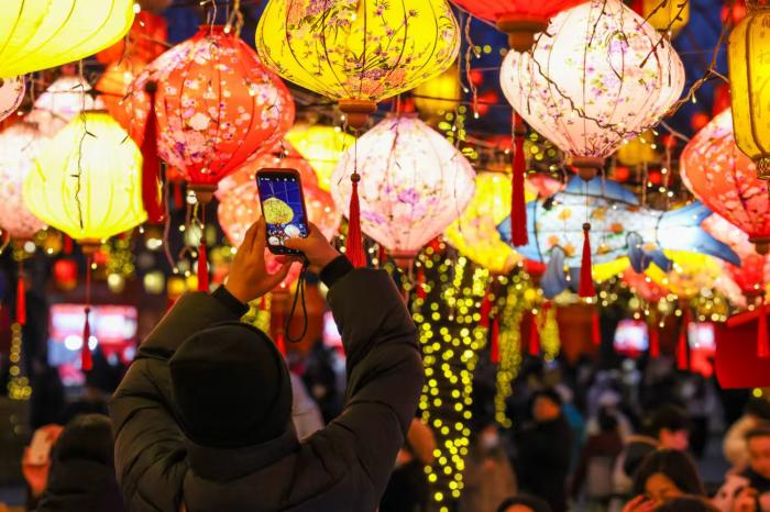 今年新春,同庆街以“花”为视觉主线,融入“马”元素,市民在骏马主题彩灯前打卡拍照。