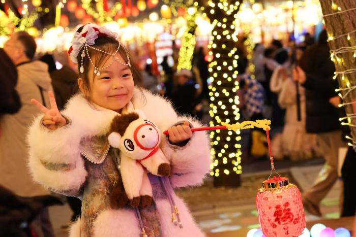 小朋友戴着小马围巾,手提花灯打卡拍照。
