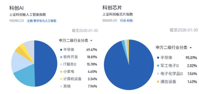 在科创板中,恰好有两只指数分别对应人工智能和芯片这两条赛道——上证科创板人工智能指数和上证科创板芯片指数。前者从科创板中选取30只业务涉及人工智能基础资源、技术及应用支持的上市公司,后者则覆盖半导体材料和设备、芯片设计、芯片制造、芯片封装和测试等芯片产业链各个环节的50家科创板公司。科创人工智能ETF易方达(588730)、科创芯片ETF易方达(589130)分别跟踪这两只指数,是布局相应领域的便捷工具。但对于普通投资者而言,应该如何选择?先把两只指数的具体特点看懂再说。