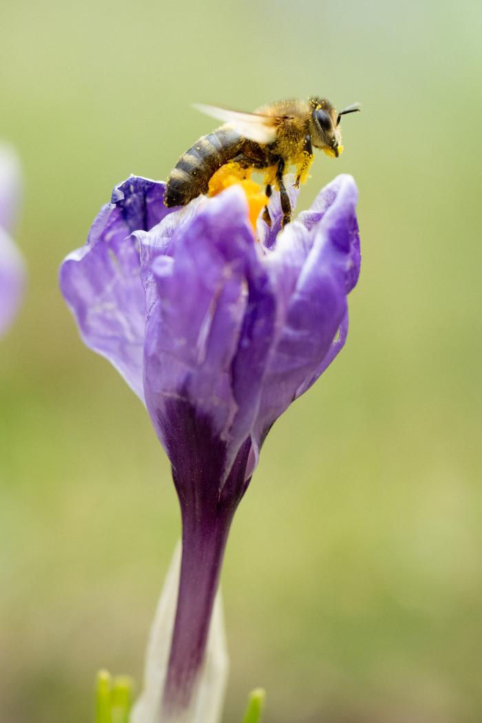 4月2日,波兰首都华沙春暖花开,蜜蜂在盛开的番红花上采蜜。