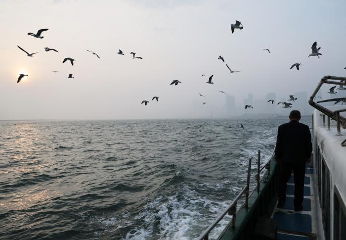 早上,陈琦乘海葬船出海(4月3日摄)。