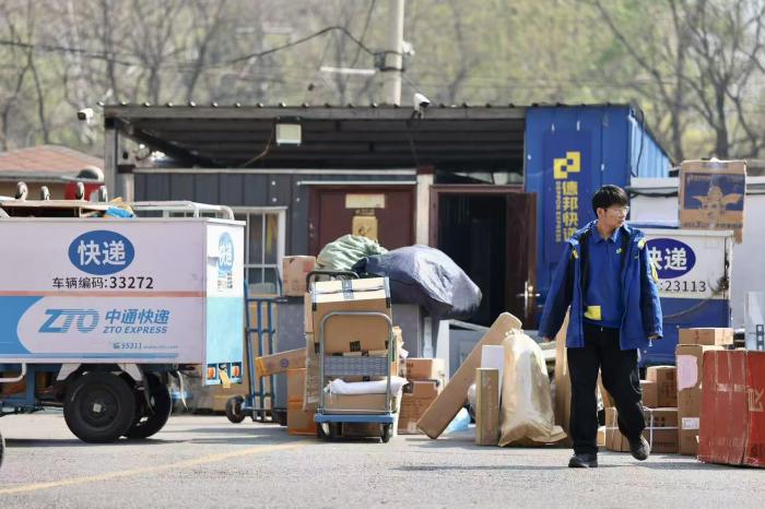 贡院胡同附近一个快递分拣站的工作人员正在工作。