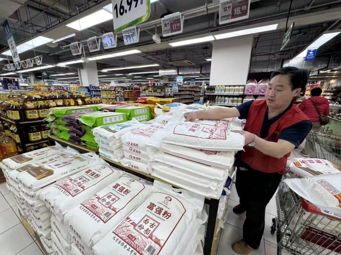 广渠门桥附近的一家超市工作人员正在整理货品。