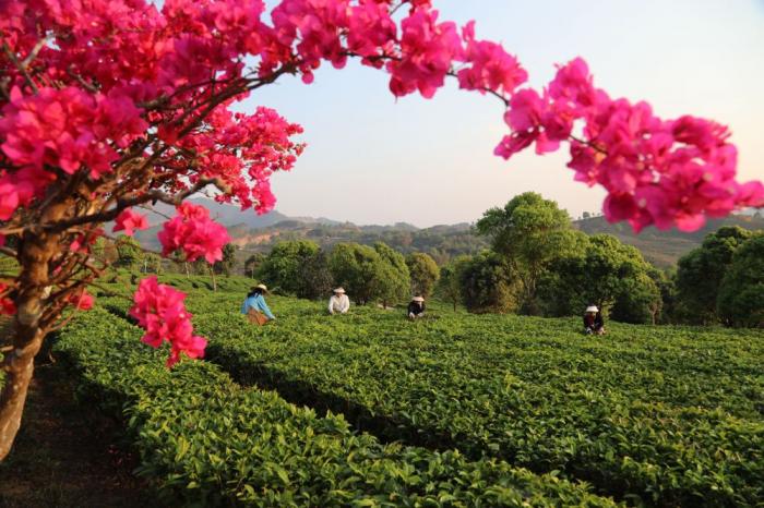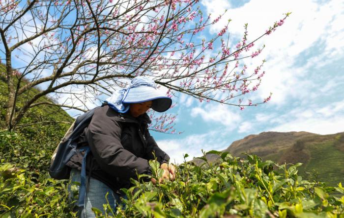 茶农在云南省普洱市宁洱哈尼族彝族自治县宁洱镇温泉村茶园采摘春茶。新华社发(杨廷荣摄)