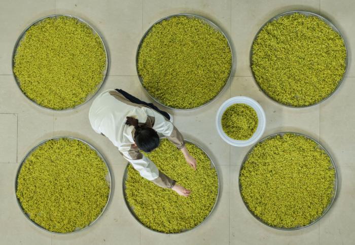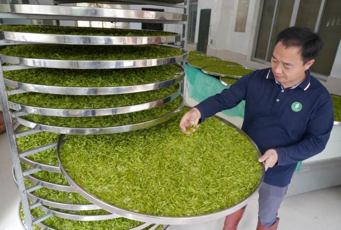 在浙江省乐清市雁荡镇能仁村,茶工在进行摊青作业。新华社发(蔡宽元 摄)