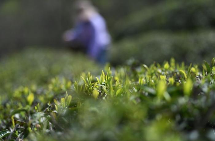 江西省樟树市昌傅镇忠心村茶农在玉云茶场采摘明前茶。新华社发(周亮 摄)
