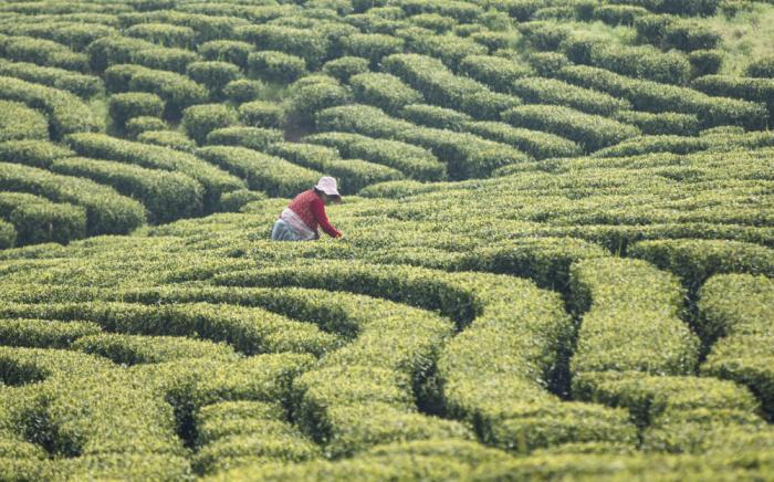 茶农在湖北省襄阳市保康县官山茶园采摘明前茶。新华社发(陈泉霖摄)
