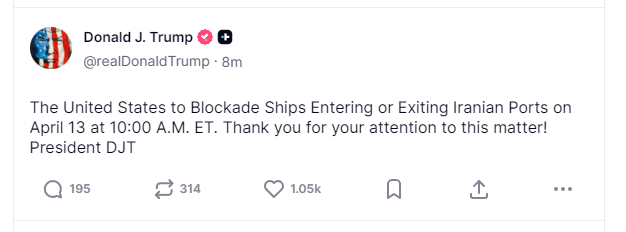 特朗普再发文:将于13日10时封锁进出伊朗港口船只