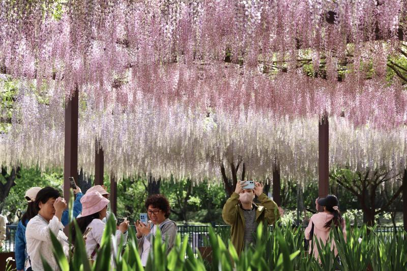 随着京城气温稳步回升,玉渊潭公园紫藤进入了一年一度的盛花期。4月24日,北京青年报记者从玉渊潭公园获悉,园内200余株、15个品种的多花紫藤即日起进入最佳观赏期,市民游客可欣赏到多种颜色搭配、紫藤花开如瀑的壮丽景象。