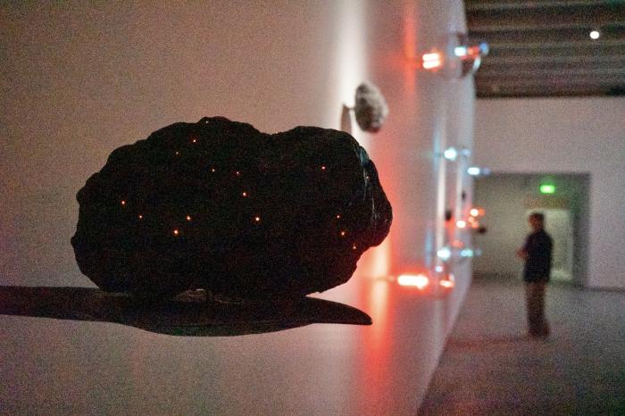 洛朗·格拉作品《无题》。一块深色岩石表面嵌着点点光亮。其深邃的质地与闪烁的光效形成对比,仿佛赋予了矿物生命。