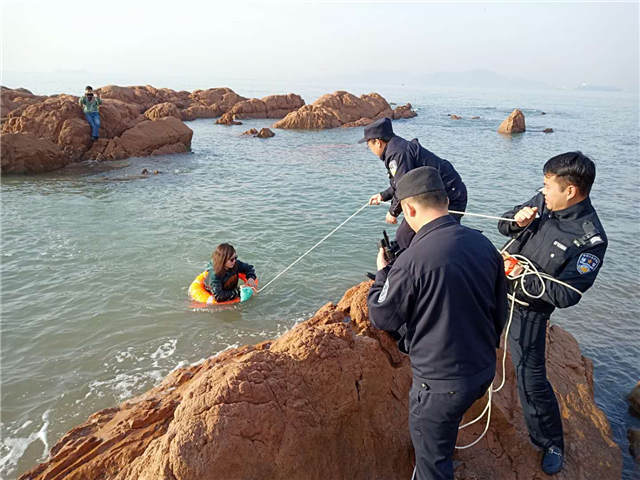 此时正值涨潮,不会游泳的游客看着所在的礁石正在被急速上涨的海水一点点淹没,非常焦急,并不断向岸边的民警大声呼救。民警一边大声呼喊稳住被困游客,一边观察了解周边情况。此时海平面比较平稳,民警找来一根长绳的救生圈,朝被困游客所在的礁石扔去,被困游客将救生圈套在身上,民警和辅警的合力将被困游客拉回岸边,最终两名游客安全上岸。