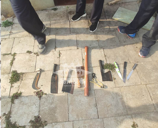 事后,民警在杨某家中搜出8把不同尺寸的刀具、一副弹弓、一根长棍。