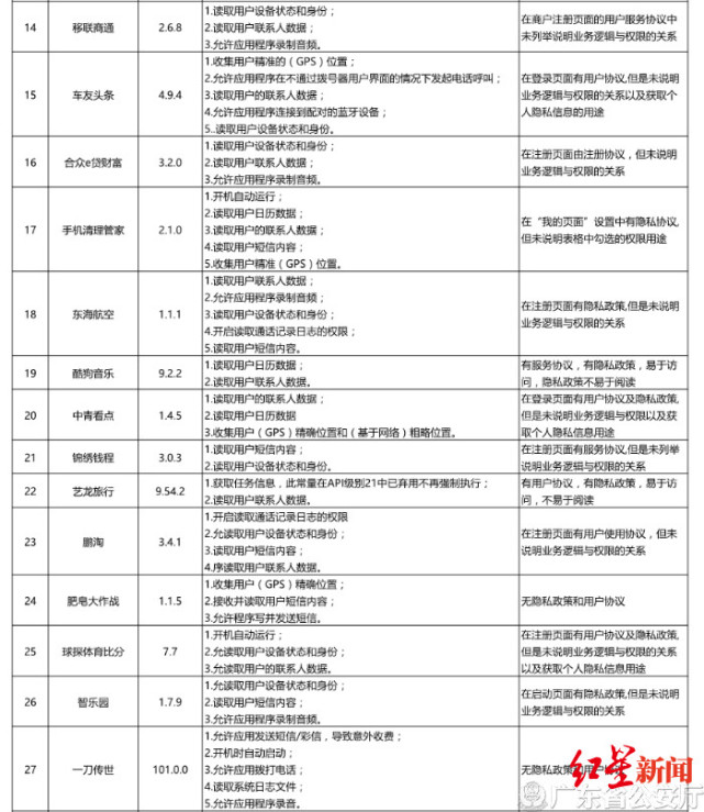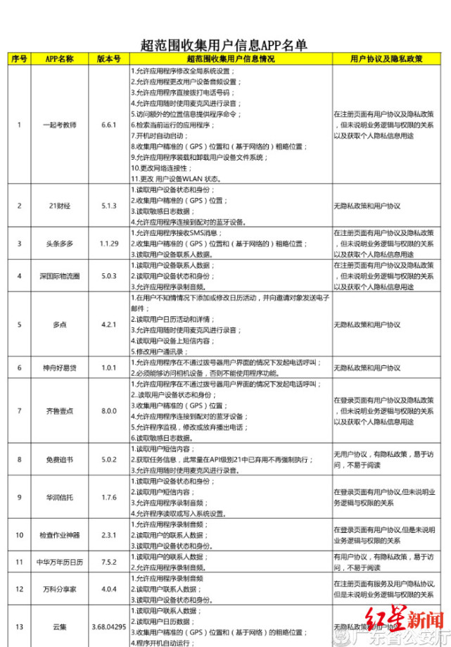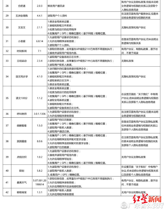 红星新闻从广东省公安厅官网了解到,广东警方持续开展超范围收集用户信息APP整治,于7月5日曝光了2019年第二季度监测发现的存在违规行为的42款APP。