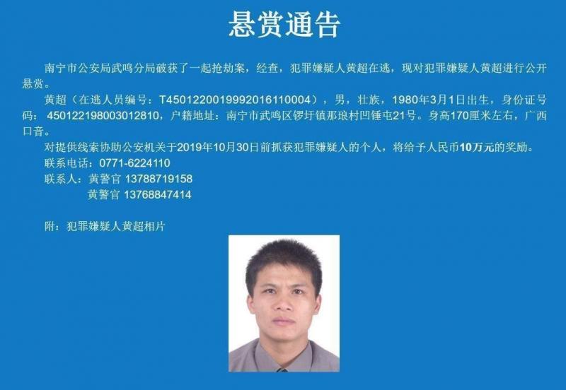 悬赏通告显示,黄超(在逃人员编号:T4501220019992016110004),男,壮族,1980年3月1日出生,身份证号码:450122198003012810,户籍地址:南宁市武鸣区锣圩镇那琅村凹锤屯21号。身高170厘米左右,广西口音。对提供线索协助公安机关于2019年10月30日前抓获犯罪嫌疑人的个人,将给予人民币10万元的奖励。