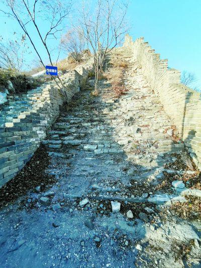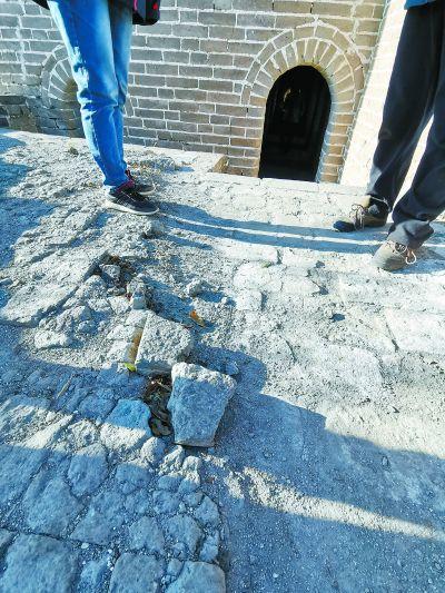 “这段也清理过,但您看,还是有很多碎砖掉下来了,人爬过的脚印还留在上面呢。有些驴友就愿意爬这样没修过的地方,旁边有好路他偏不走。”赵鹏很是无奈。