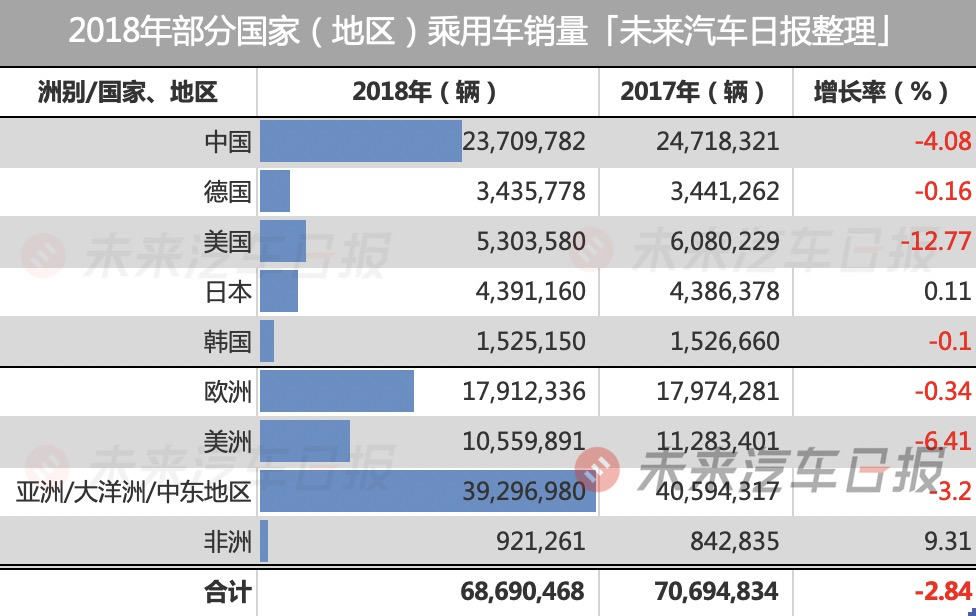 据中国汽车工业协会(以下简称“中汽协”)数据,2018年全球乘用车销量下降2.84%至6890万辆,美国销量甚至下降了12.77%。
