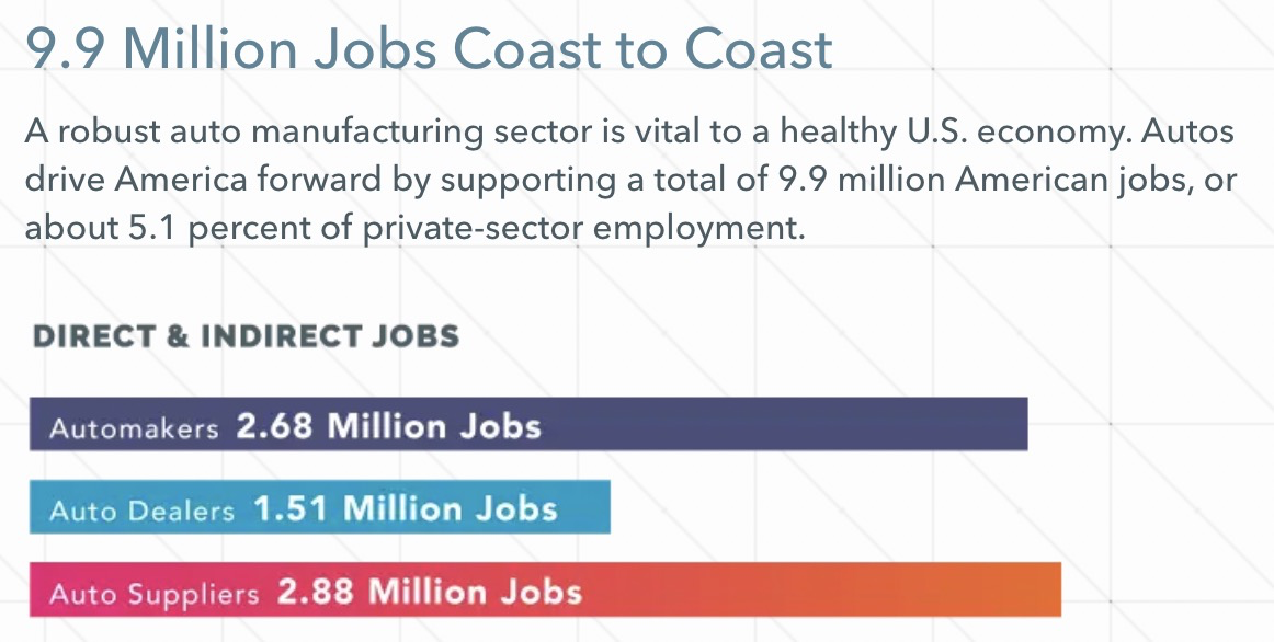 据美国汽车工业联盟数据,汽车产业为美国提供了990万个就业岗位,为美国经济带来9530亿美元收入。道琼斯工业平均指数列出的公司中,有一半依靠汽车产业获得收入。
