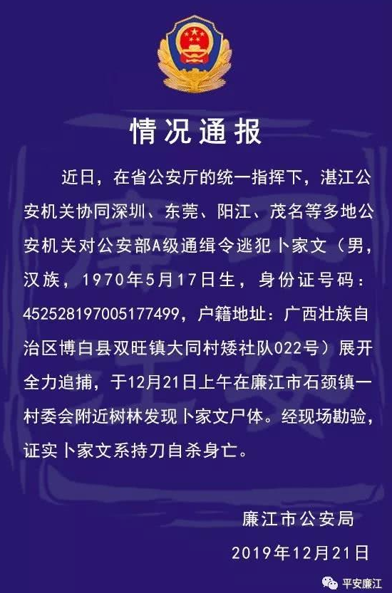 据广东省廉江市公安局12月21日消息,近日,在省公安厅的统一指挥下,湛江公安机关协同深圳、东莞、阳江、茂名等多地公安机关对公安部A级通缉令逃犯卜家文(男,汉族,1970年5月17日生,身份证号码:452528197005177499,户籍地址:广西壮族自治区博白县双旺镇大同村矮社队022号)展开全力追捕,于12月21日上午在廉江市石颈镇一村委会附近树林发现卜家文尸体。经现场勘验,证实卜家文系持刀自杀身亡。