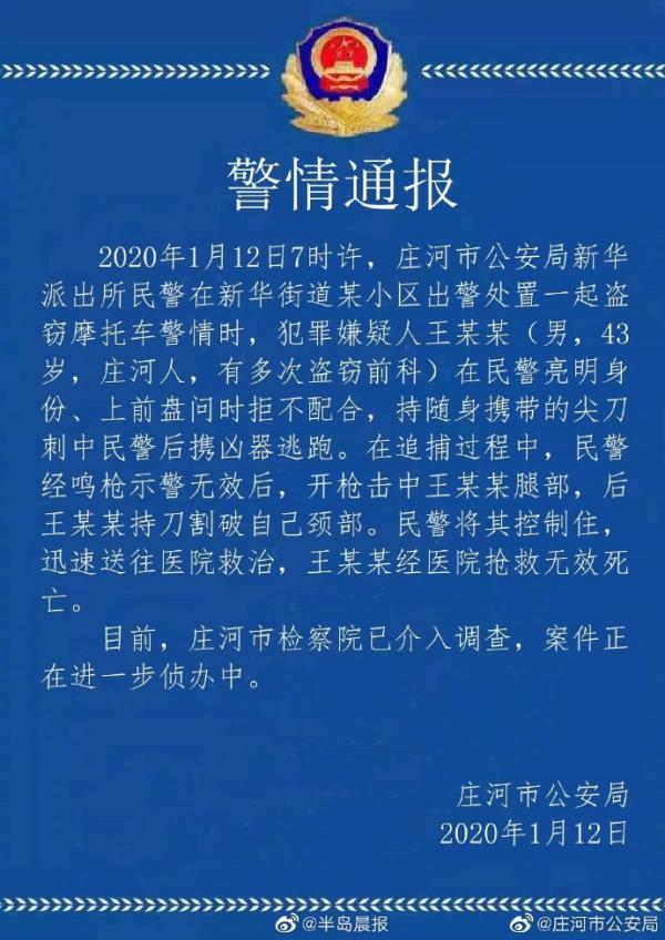 2020年1月12日7时许,庄河市公安局新华派出所民警在新华街道某小区出警处置一起盗窃摩托车警情时,犯罪嫌疑人王某某(男,43岁,庄河人,有多次盗窃前科)在民警亮明身份、上前盘问时拒不配合,持随身携带的尖刀刺中民警后携凶器逃跑。