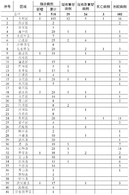 新增确诊病例中,万州区1例、南岸区1例、长寿区1例、合川区1例、綦江区3例、奉节县1例、两江新区1例;新增重型病例为巫溪县1例;重型病例转普通型病例为开州区1例;重型病例转危重型病例中,合川区1例、潼南区1例;危重型病例转重型病例中,万州区1例、奉节县1例;新增出院病例中,万州区1例、大渡口区2例、九龙坡区2例、南岸区1例、渝北区1例、长寿区5例、綦江区1例、璧山区1例、两江新区1例。