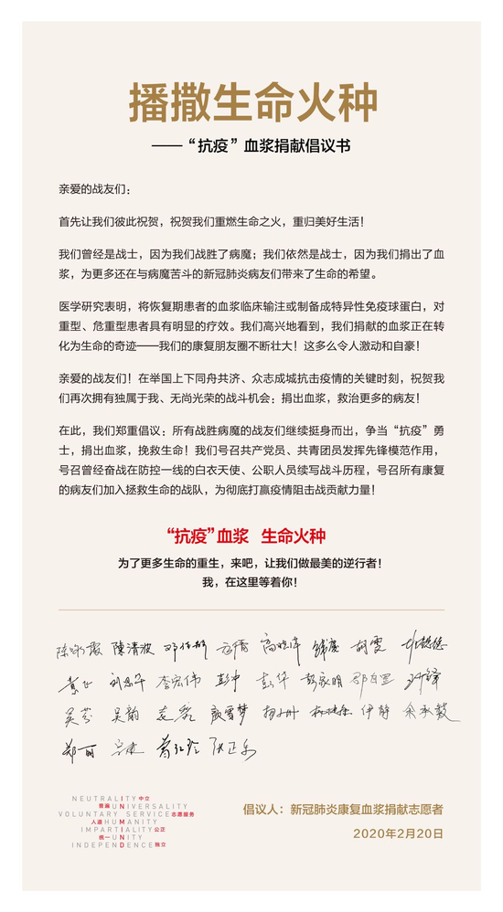 2月20日,28名新冠肺炎康复血浆捐献志愿者通过中国红十字基金会向社会倡议:“所有战胜病魔的战友们继续挺身而出,争当“抗疫”勇士,捐出血浆,挽救生命!”《倡议书》号召“共产党员、共青团员发挥先锋模范作用,曾经奋战在防控一线的白衣天使、公职人员续写战斗历程,所有康复的病友们加入拯救生命的战队,为彻底打赢疫情阻击战贡献力量!”《倡议书》希望捐献朋友圈不断壮大:“为了更多生命的重生,让我们做最美的逆行者!我,在这里等着你!”