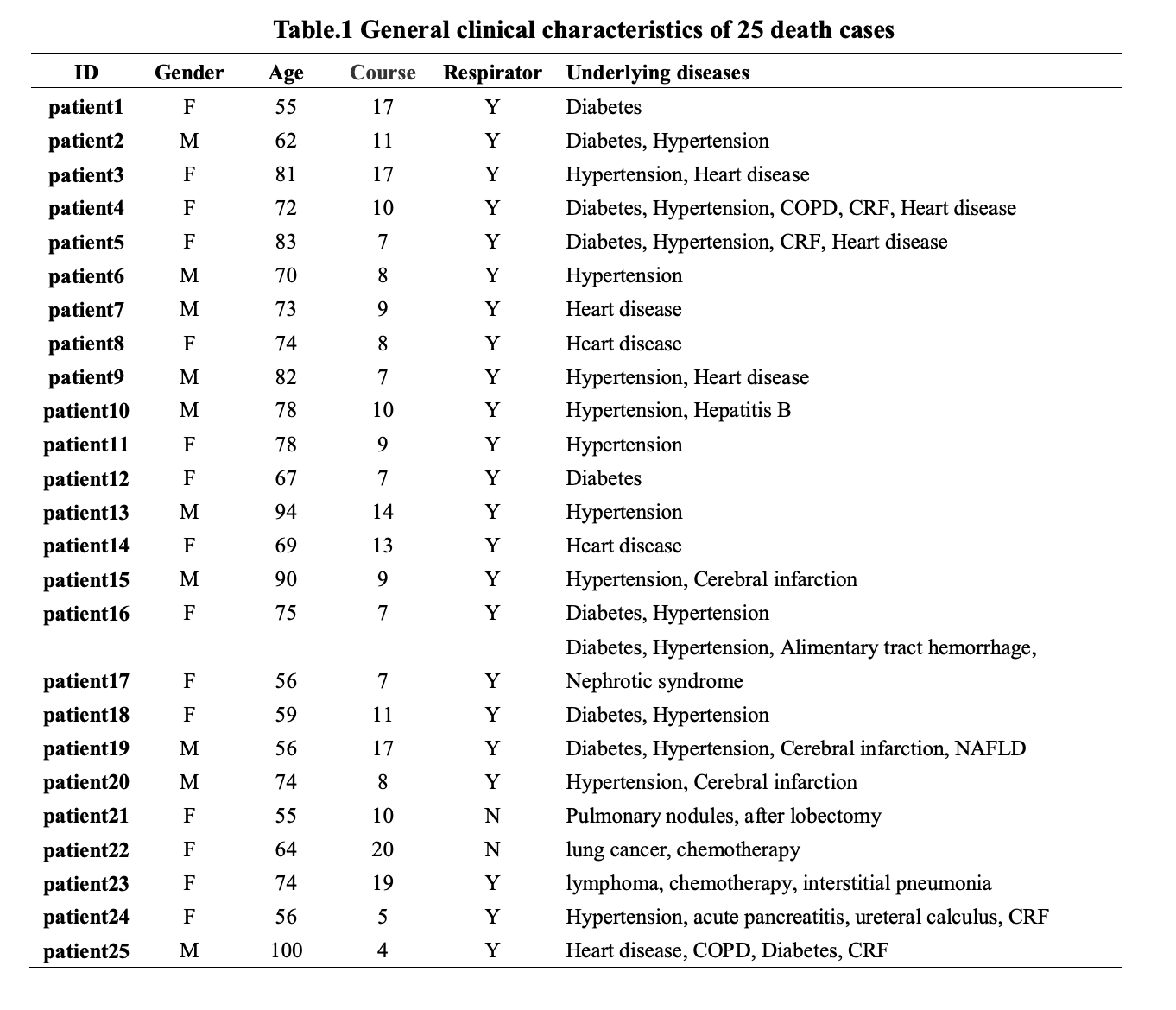 25 名死亡病患的一般临床特征:均患有基础疾病,其中16例有高血压,10 例有糖尿病,8 例有心脏病,5 例有肾脏疾病,4 例有脑梗塞,2 例有慢性阻塞性肺疾病,2 例有恶性肿瘤,1 例有急性胰腺炎。