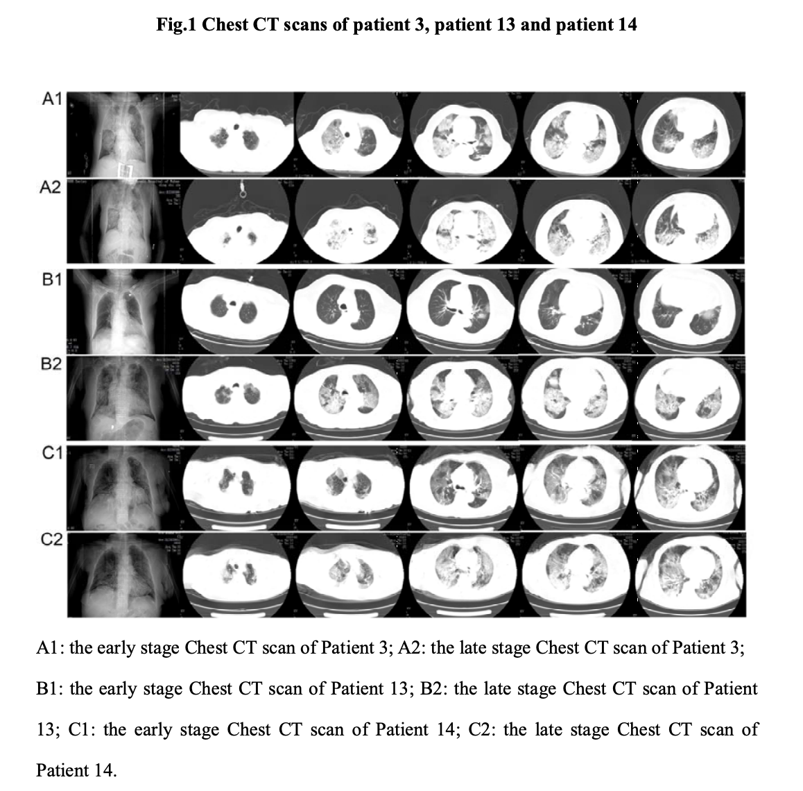 A1与A2,B1与B2,C1与C2分别为三名患者的早期与晚期胸部CT扫描