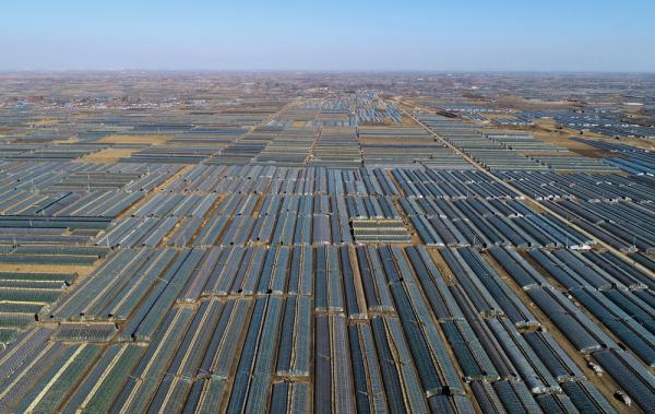 这是河北省乐亭县新寨镇设施鲜桃规模化生产区(3月12日摄,无人机照片)。