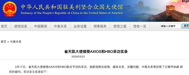 海外网3月23日综合报道 据中国驻美国大使馆官网消息,3月17日,崔天凯大使接受AXIOS和HBO联合节目的采访,就新冠肺炎疫情、媒体关系、涉疆问题、中美关系等回答了记者乔纳森·斯旺的提问。采访全文实录如下: