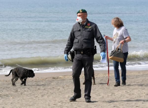 3月21日,在意大利罗马附近的奥斯蒂亚,意大利宪兵检查一名沙滩上遛狗的女子 新华社发