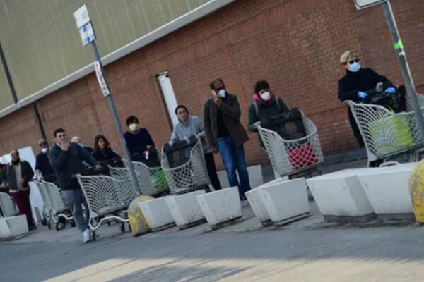 3月20日,在意大利博洛尼亚,人们在超市外排队等待购物 新华社发