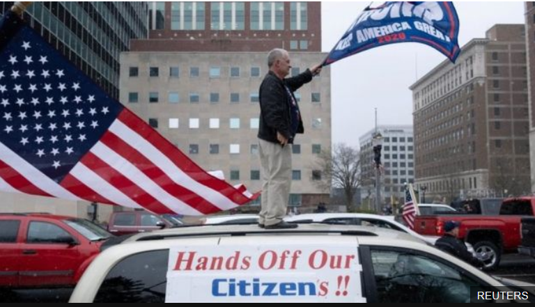 一位手持“让美国再次伟大”条幅的示威者抗议“封城” 图源:路透社