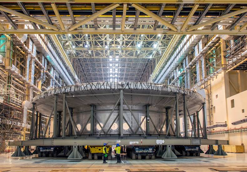 澎湃新闻从中核集团获悉,当地时间4月21日,国际热核聚变实验堆(ITER)组织在法国举办杜瓦底座移交仪式。至此,由中核集团牵头的中法联合体克服了重重困难,按期开展杜瓦底座接收及吊装准备工作,为“人造太阳”核心设备后续安装工作的全面开展创造有利条件。