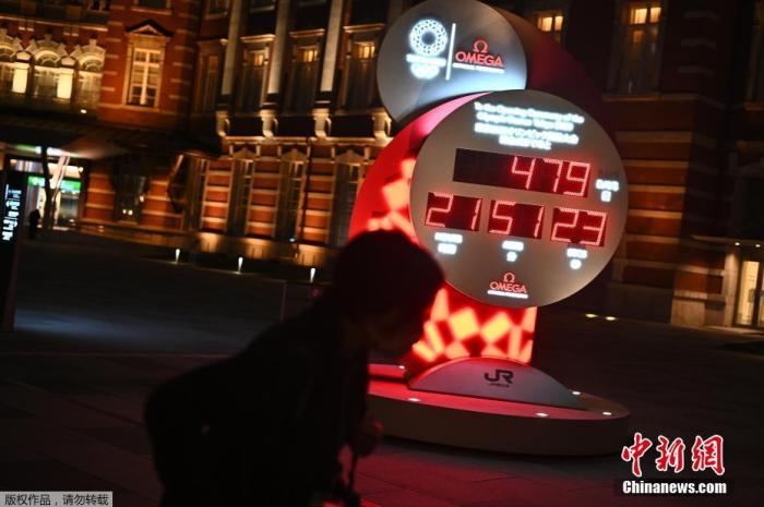 资料图:当地时间3月30日晚,东京奥组委在东京举行记者会,宣布日本政府、东京都政府、东京奥组委与国际奥委会共同决定东京奥运会、残奥会分别将于2021年7月23日和8月24日开幕。图为东京街头的奥运会倒计时牌重新启动计时