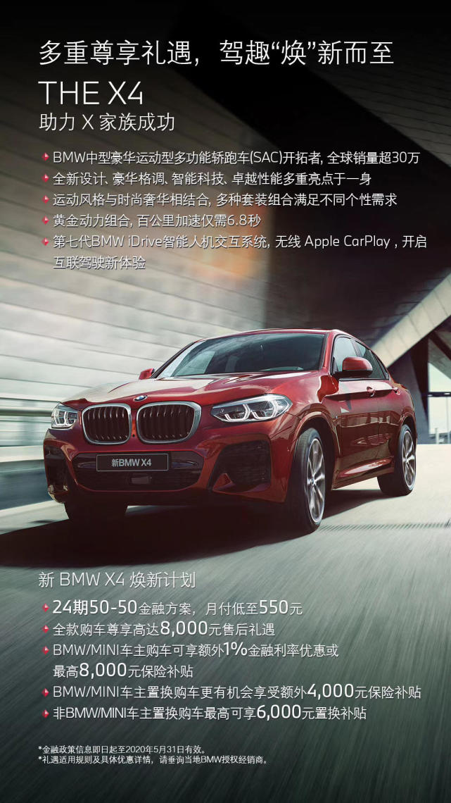 BMW近日针对旗下车型推出BMW“焕新计划” ,凡购买新BMW X4的用户,即有机会尊享月付低至550元的24期50-50金融方案及其他礼遇。