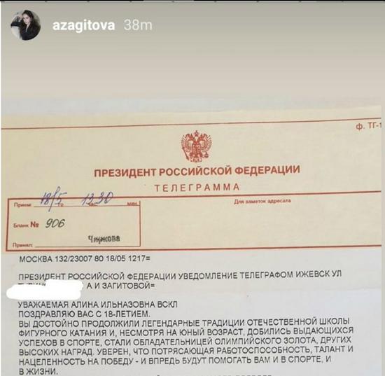 无需赘言,在生日这天收到总统的祝福,扎吉托娃的生日绝对是有排场,也足以让扎吉托娃“吹一波”。而扎吉托娃自然也要显摆一下,她感谢总统普京的同时,也在个人社交平台页面上分享了普京“贺电”的照片。
