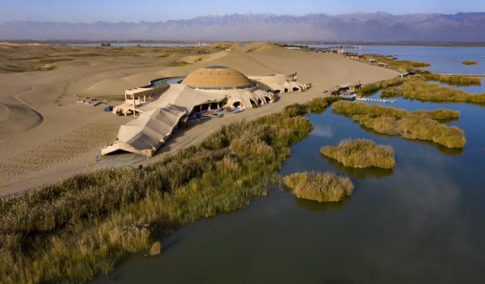 位于宁夏石嘴山市平罗县境内的沙湖景区(2019年10月30日摄,无人机照片)。