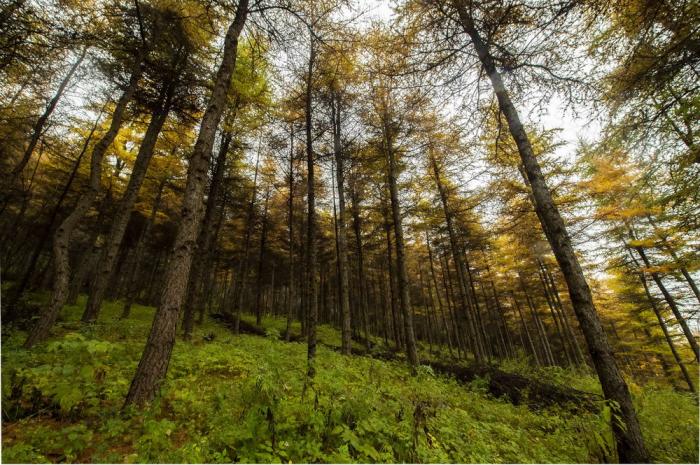 宁夏固原市泾源县境内六盘山落叶松林(2019年10月5日摄)。