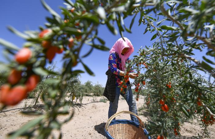 工人在宁夏吴忠市红寺堡区百瑞源原生态枸杞种植基地采摘头茬枸杞(6月5日摄)。