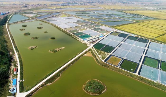 宁夏银川市贺兰县蓝湾生态园南美对虾养殖基地(2018年9月11日摄,无人机照片)。