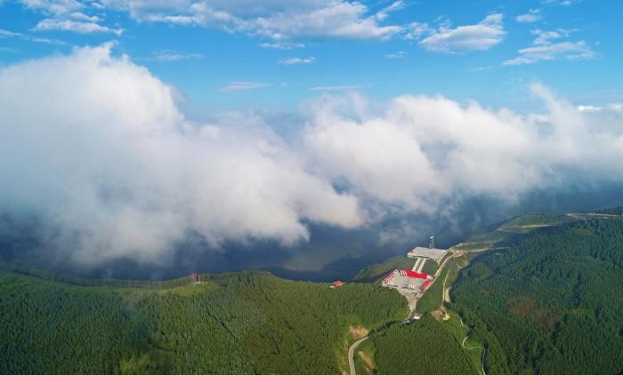 位于宁夏固原市隆德县境内的六盘山红军长征纪念亭在云海与绿林中格外醒目(2018年8月29日摄,无人机照片)。