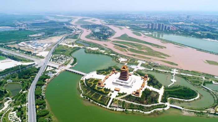 位于宁夏吴忠市青铜峡市的黄河楼(2018年6月26日摄,无人机照片)。