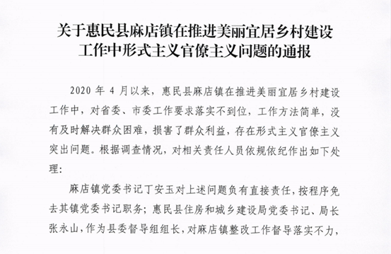 7月2日,山东滨州市纪委发布一则《关于惠民县麻店镇在推进美丽宜居乡村建设工作中形式主义官僚主义问题的通报》。