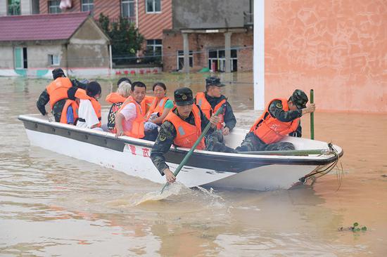 7月10日,上饶市鄱阳县昌洲乡大量房屋被洪水淹没,武警江西省总队机动支队官兵利用冲锋舟转移被困群众